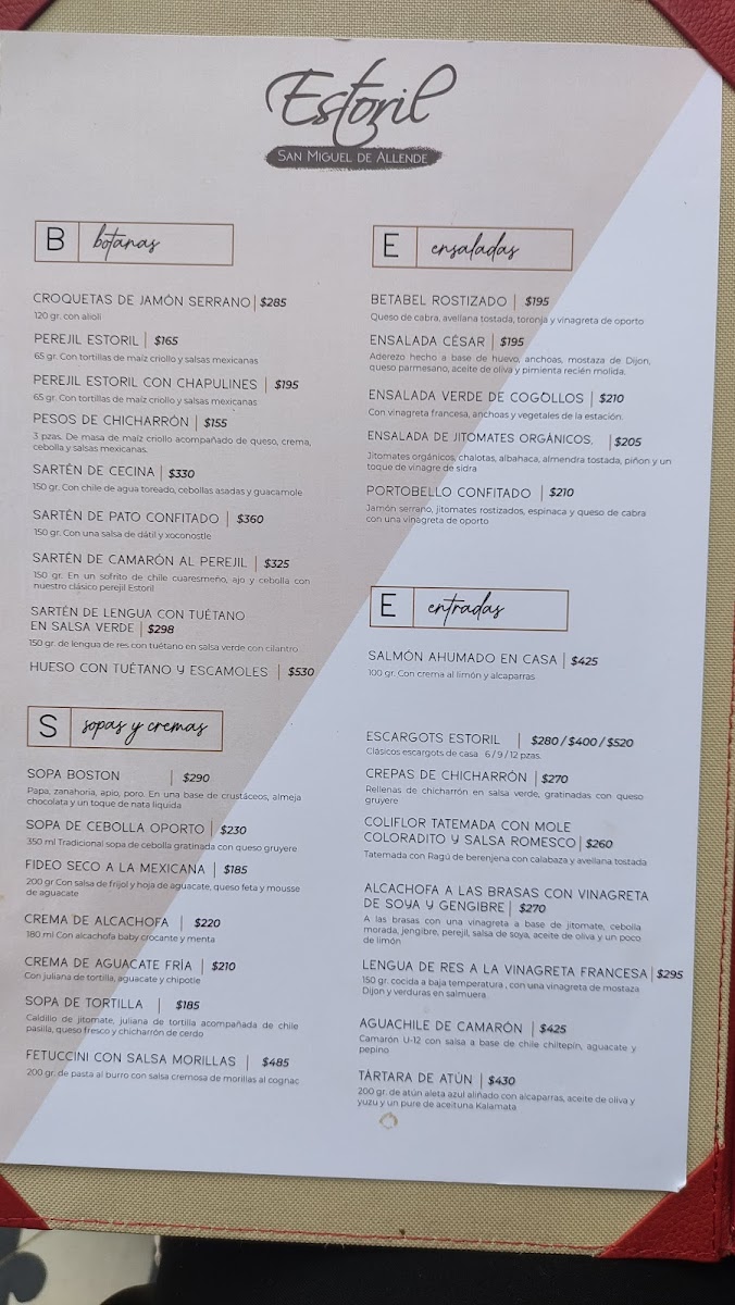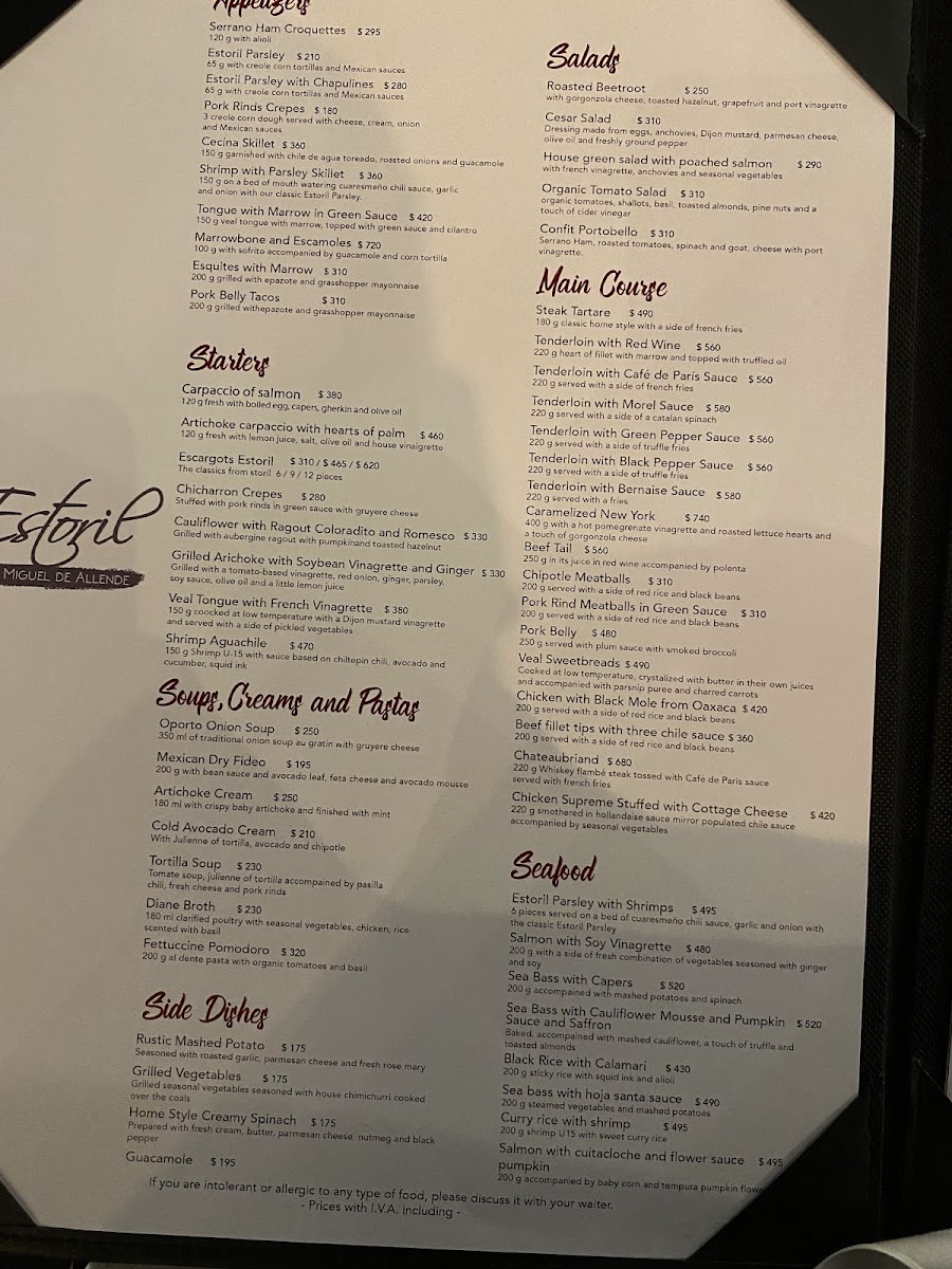 The menu at Estoril y Murasaki offers a thoughtful blend of refined flavors and comforting dishes that complement its elegant yet inviting atmosphere. Guests can expect a range of carefully crafted options, from light appetizers like Spicy Edamame and a Salmon Appetizer Platter, to more substantial choices such as Filete Chateaubriand and Robalo served with puréed cauliflower and seasonal sauces.